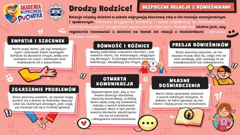 Jednym z przykładów inicjatyw wspierających dzieci w budowaniu zdrowych relacji jest Akademia Bezpiecznego Puchatka. Podczas zajęć dzieci uczą się rozpoznawania emocji, radzenia sobie w trudnych sytuacjach i rozwijania empatii – a także tego, jak być dobrym kolegą i koleżanką. Edukacja emocjonalna i społeczna w pierwszych latach nauki ma kluczowe znaczenie. Program promuje relacje oparte na szacunku, zrozumieniu i bezpieczeństwie.W roku szkolnym 2024/2025 Akademia Bezpiecznego Puchatka objęła swoim zasięgiem ponad 240 tys. pierwszoklasistów, 13 tys. nauczycieli i 5,5 tys. szkół podstawowych w Polsce. Od początku istnienia programu wzięło w nim udział już ponad 3,5 mln uczniów – co czyni go największą tego typu inicjatywą edukacyjną w kraju.