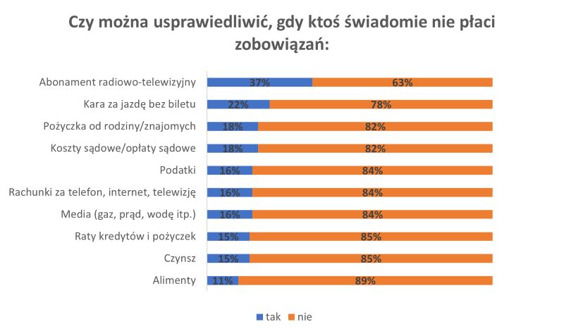Co istotne, Polacy w zdecydowanej większości deklarowali brak akceptacji dla niepłacenia różnego rodzaju zobowiązań finansowych – w większości przypadków odpowiedzi negatywnej udzieliło ponad 80 proc. respondentów. Są jednak wyjątki. Na tym tle pojawia się stosunkowo duża skłonność do usprawiedliwiania niepłacenia abonamentu radiowo-telewizyjnego (37 proc.) czy kar za jazdę bez biletów (22 proc.). Najrzadziej usprawiedliwiano niepłacenie czynszów oraz alimentów, przy czym wskaźnik akceptujących na poziomie 15 i 11 proc. nadal uznać można za wysoki.