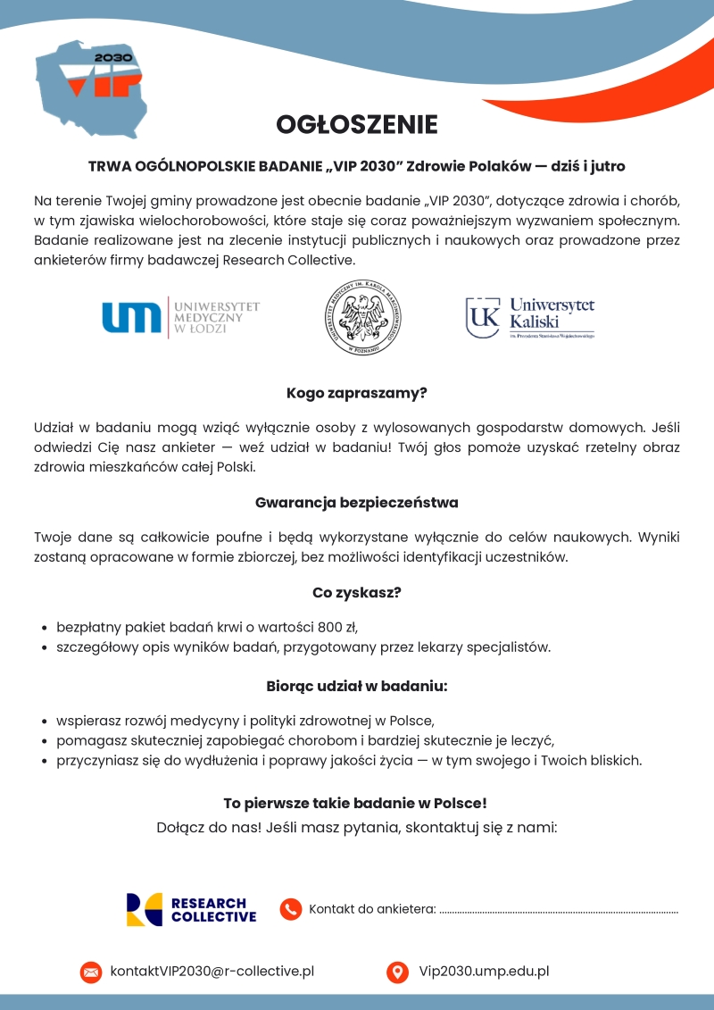 W ramach ogólnopolskiego projektu VIP 2030 badania są prowadzone w gminach: Świerzawa, Piechowice, Kąty Wrocławskie, Kamienna Góra, Głogów, Wrocław, Książki, Gostycyn, Świecie, Zławieś Wielka, Grudziądz, Bydgoszcz, Telatyn, Karczmiska, Zamość, Nałęczów, Lublin, Puławy, Bogdaniec, Górzyca, Międzyrzecz, Czerwieńsk, Zielona Góra, Gorzów Wielkopolski, Ręczno, Świnice Warckie, Żychlin, Moszczenica, Zgierz, Łódź, Grybów, Sułoszowa, Lubień, Korzenna, Chrzanów, Kraków, Sypniewo, Zakroczym, Milanówek, Pionki, Pruszków, M. st. Warszawa, Świerczów, Kamiennik, Skarbimierz, Paczków, Kędzierzyn-Koźle, Opole, Laszki, Raniżów, Nowa Sarzyna, Sanok, Stalowa Wola, Rzeszów, Perlejewo, Dziadkowice, Bielsk Podlaski, Zabłudów, Suwałki, Białystok, Bobowo, Mikołajki Pomorskie, Starogard Gdański gmina miejska, Kępice, Starogard Gdański gmina wiejska, Gdańsk, Ożarowice, Irządze, Zbrosławice, Sośnicowice, Sosnowiec, Katowice, Wojciechowice, Złota, Jędrzejów, Kazimierza Wielka, Ostrowiec Świętokrzyski, Kielce, Janowiec Kościelny, Piecki, Kętrzyn, Orneta, Olsztyn, Elbląg, Szamocin, Chrzypsko Wielkie, Rawicz, Kłodawa, Poznań, Kalisz, Cedynia, Widuchowa, Drawsko Pomorskie, Barlinek, Koszalin, Szczecin.Mieszkańcy wylosowani z bazy TERYT są odwiedzani przez wykwalifikowanych ankieterów i otrzymują zaproszenie do bezpłatnego udziału w kompleksowych badaniach zdrowotnych. To wyjątkowa okazja dla lokalnej społeczności, aby skorzystać z nowoczesnej diagnostyki medycznej, która na co dzień jest bardzo kosztowna i trudno dostępna. Każdy uczestnik otrzymuje szczegółowe wyniki badań wraz z indywidualnymi zaleceniami zdrowotnymi. Udział mieszkańców naszej gminy w tym prestiżowym projekcie badawczym przyczynia się nie tylko do poprawy ich stanu zdrowia, ale także do stworzenia ogólnopolskiej bazy wiedzy o wielochorobowości, która posłuży przyszłym pokoleniom.