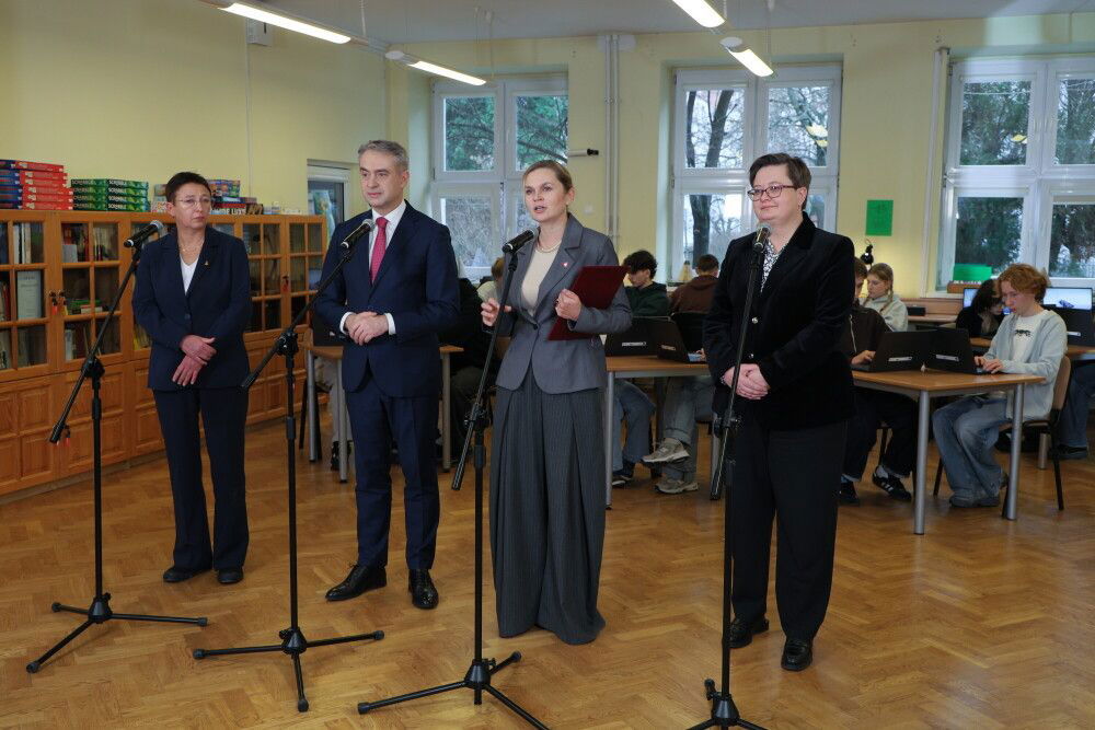 Warszawa, 16.12.2025. Wicepremier, minister cyfryzacji Krzysztof Gawkowski (2L), minister edukacji Barbara Nowacka (2P), wiceminister edukacji Katarzyna Lubnauer (P) oraz dyrektor VI LO Małgorzata Tudek (L) podczas konferencji prasowej nt. „Cyfrowy Uczeń, czyli cyfrowa transformacja edukacji – wyposażenie szkół w laptopy, laptopy przeglądarkowe i tablety w ramach inwestycji KPO, realizowanej wspólnie przez Ministerstwo Cyfryzacji i Ministerstwo Edukacji Narodowej”, 16 bm. w VI Liceum Ogólnokszt