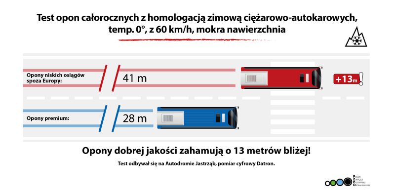 Testy opon ciężarowych i autokarowych całorocznych z homologacją zimową wyraźnie pokazują, jak ogromne znaczenie dla bezpieczeństwa ma jakość ogumienia. To właśnie opony decydują o przyczepności pojazdu, stabilności jazdy oraz długości drogi hamowania. W przypadku dużych pojazdów, takich jak autokary czy ciężarówki, różnice w drodze hamowania mogą wynosić nawet kilkanaście metrów. Przy dużych prędkościach taka odległość często decyduje o tym, czy uda się uniknąć wypadku. Wyniki testów przeprowadzonych przez PZPO wraz Politechniką Rzeszowską oraz ekspertem motoryzacyjnym – Grzegorzem Dudą pokazały istotne różnice: