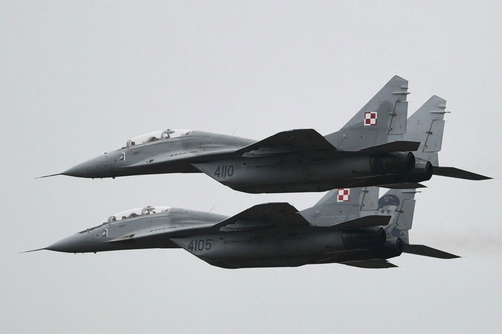 Malbork, 21.03.2023. Przelot samolotów MiG-29 Sił Powietrznych RP podczas dnia otwartego dla mediów w 22. Bazie Lotnictwa Taktycznego w Malborku, 21 bm. (jm) PAP/Adam Warżawa
