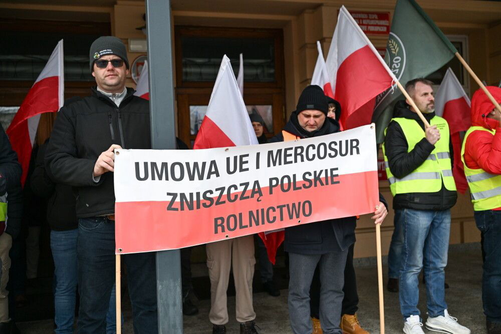 Kilkudziesięciu rolników manifestuje od godz. 11 przed Świętokrzyskim Urzędem Wojewódzkim w Kielcach. O godz. 14 mają złożyć petycję do premiera na ręce wojewody. Artur Konarski, przewodniczący NSZZ Solidarność RI powiedział PAP, że zgromadzeni protestują przede wszystkim przeciwko umowie Mercosur. Konarski zaznaczył, że według jego szacunków, jeśli umowa UE z krajami Ameryki Płd. wejdzie w życie, to 85-90 polskich gospodarstw grozi bankructwo.