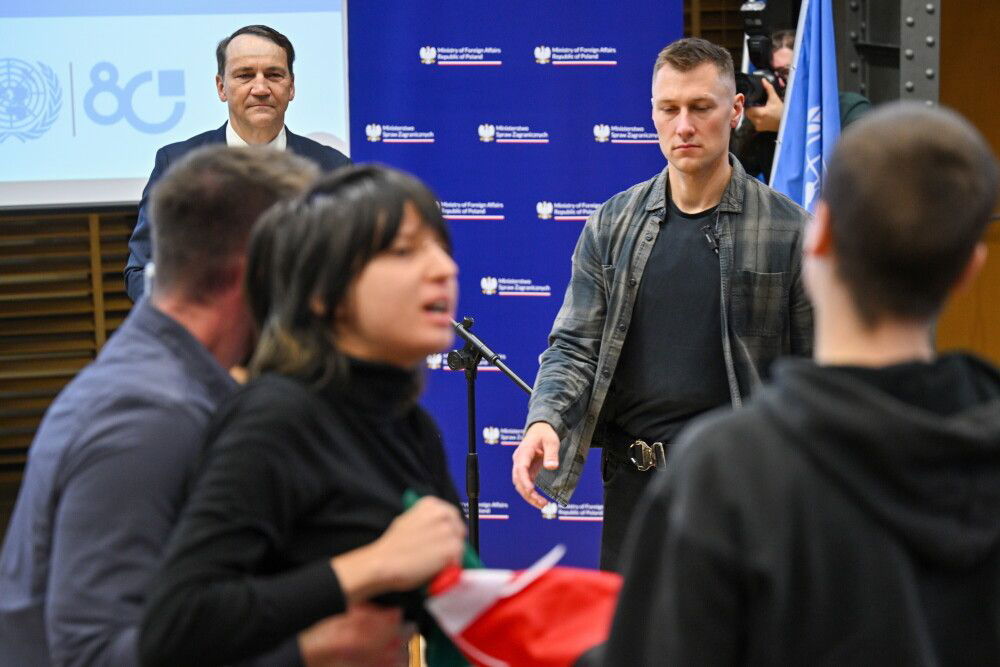 Podczas wystąpienia Sikorskiego na Uniwersytecie Warszawskim z okazji 80-lecia ONZ na scenę wtargnęły studentki uczelni z flagą Palestyny na plecach, wykrzykując, że Sikorski „wspiera ludobójstwo” w Palestynie. Chwilę później ochrona wyprowadziła je z sali.