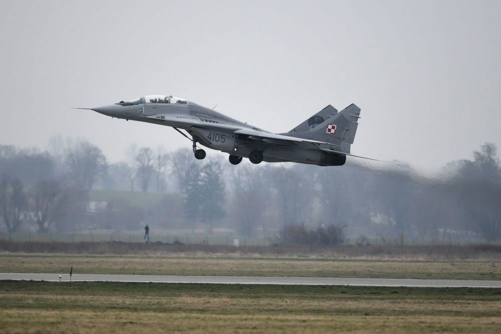 Malbork, 15.02.2023. Myśliwiec MiG-29 podczas Media Day w 22. Bazie Lotnictwa Taktycznego w Malborku, 15 bm. W ramach wydarzenia odbyły się loty pilotów z malborskiej jednostki na samolotach MiG–29 oraz komponentu holenderskich Sił Powietrznych na myśliwcach F-35. (mr) PAP/Adam Warżawa