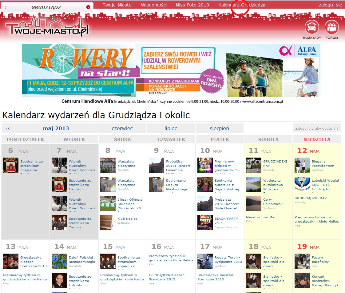 1. W prawym górnym rogu klikamy na Kalendarz miasta, w którym aktualnie się znajdujemy. Po kliknięciu przejdziemy do kalendarza wydarzeń.