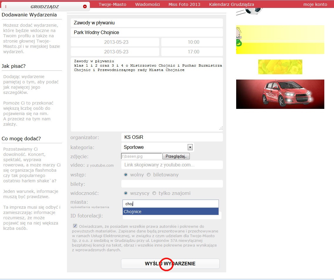 3. Kiedy już się zalogujemy, klikamy na dodaj wydarzenie tak jak na załączonym obrazku.